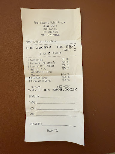 CottoCrudo, located inside the Four Seasons Hotel in Prague, offers a truly elegant and refined setting, definitely the highlight of the experience. Service was generally good, though not flawless, as they forgot one course, which was later corrected without much issue.