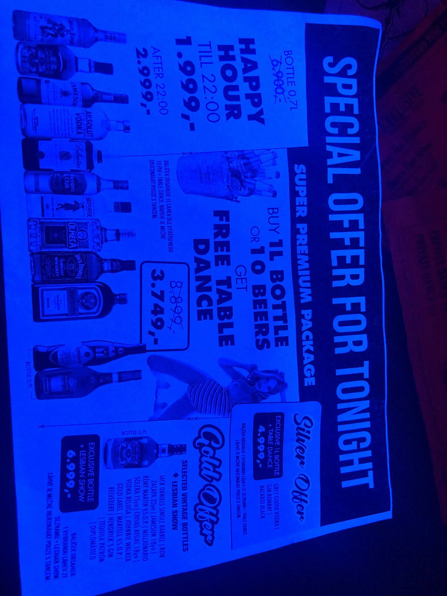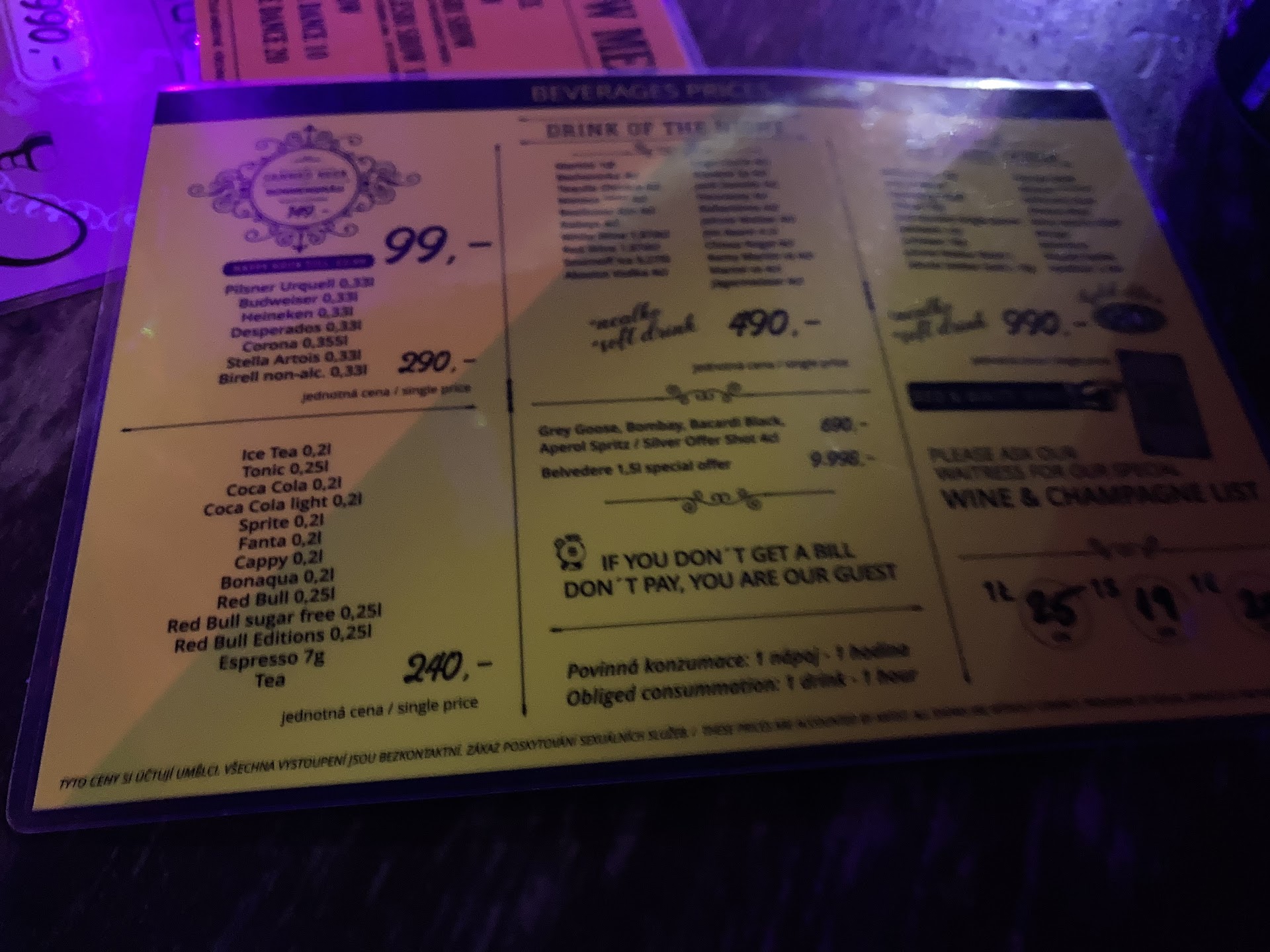 It was a pity, because aside from the bar service flipping out about that bottle I had a pretty good time. I would have thought they would be happy to give me that extra reason to keep coming back (I was spending quite a bit of money buying drinks for the girls), but apparently they see it as a threat to their profits to let someone drink their entire bottle in the club, so instead they treated me in a way that guaranteed I won't return. A bottle costs 3500 crowns for 1L, by the way. Probably a decent choice when you've got some buddies to help...
