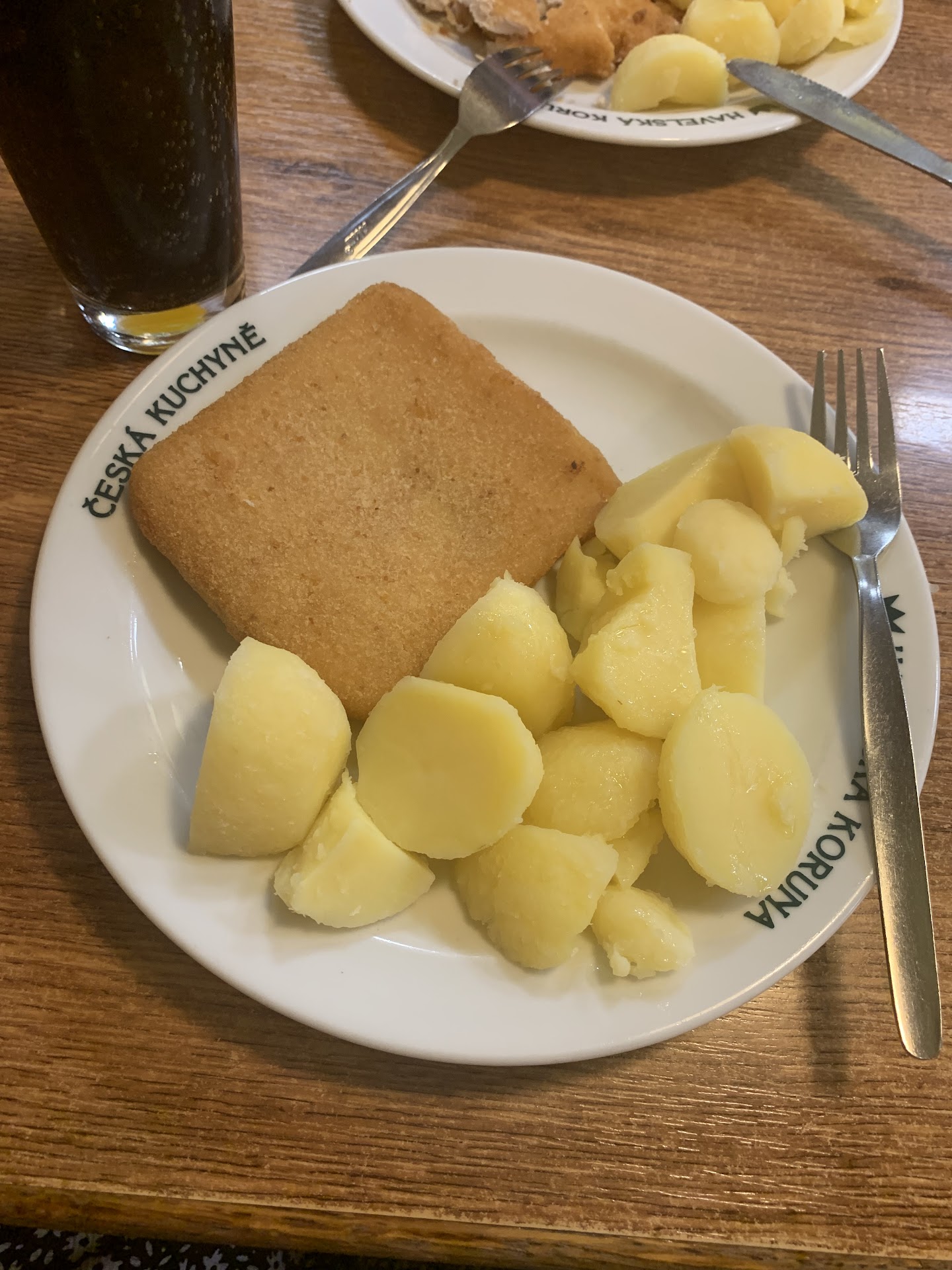 Food served here is what's considered home cooking in Czechia. The portions are good for the price asked. I went for a pork schnitzel with potato salad, whereas my wife went for a beef goulash with bread dumplings. The schnitzel was nice, thin and crunchy. The potato salad had peas and carrots in it and it was seasoned ok. Didn't feel the need to put any extra salt or pepper. The beef goulash was nice, as well: the meat was well cooked, the tomato sauce was salty and hearty and the bread dumplings were plain on their own, but soaked in the flavour of the sauce very well.
