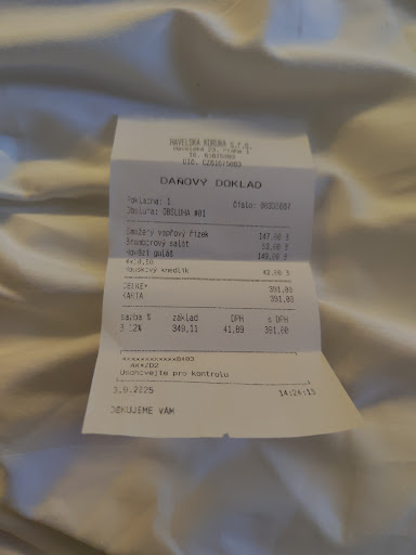 Food served here is what's considered home cooking in Czechia. The portions are good for the price asked. I went for a pork schnitzel with potato salad, whereas my wife went for a beef goulash with bread dumplings. The schnitzel was nice, thin and crunchy. The potato salad had peas and carrots in it and it was seasoned ok. Didn't feel the need to put any extra salt or pepper. The beef goulash was nice, as well: the meat was well cooked, the tomato sauce was salty and hearty and the bread dumplings were plain on their own, but soaked in the flavour of the sauce very well.