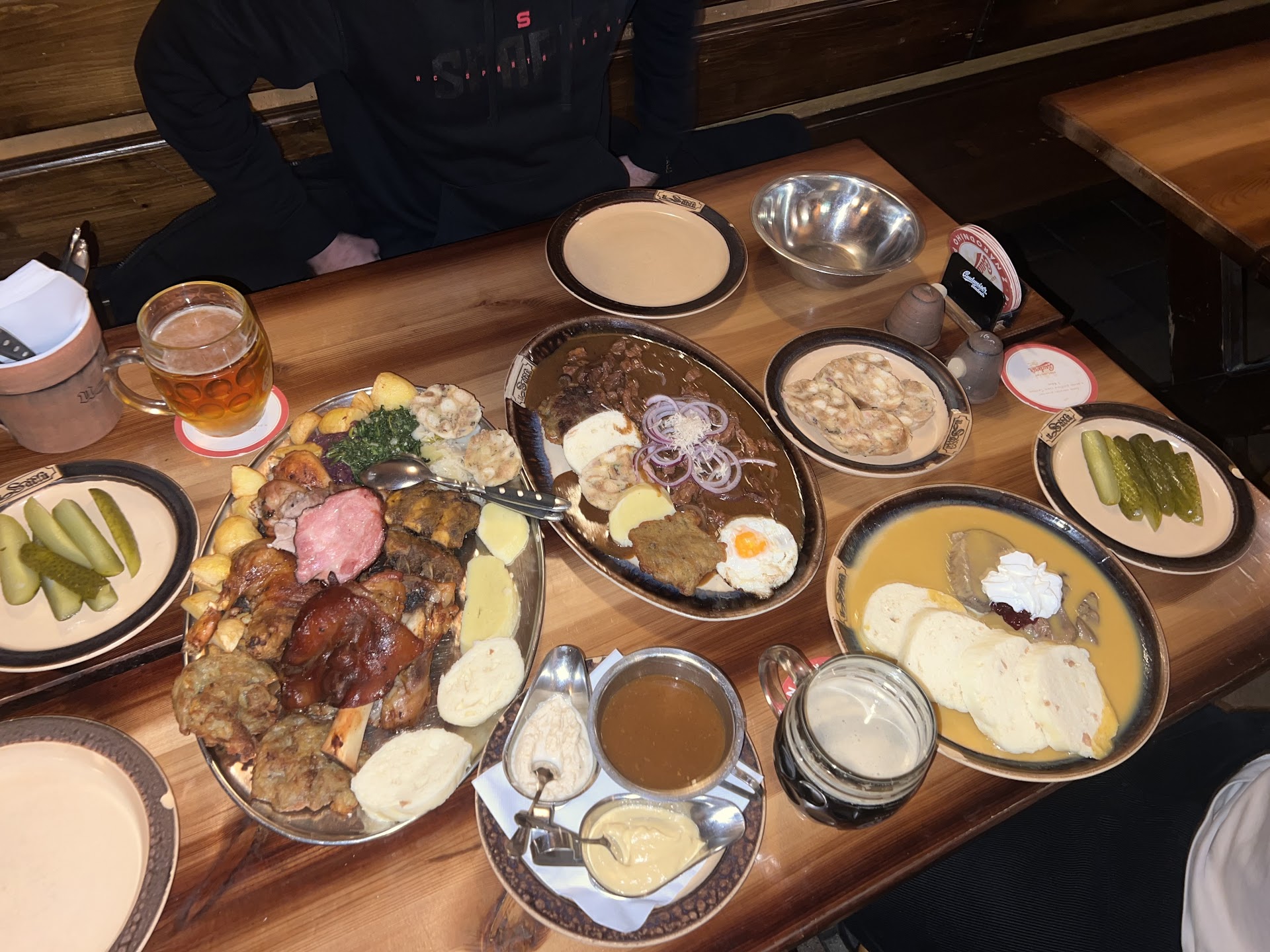 The ‘Old Czech platter’ featured; Roasted duck, roasted ribs, pork knuckle, roasted drumsticks, smoked and roasted chuck steak, red and white cabbage, spinach, speck, potato and knedlíky (Czech dumplings). The roasted duck was tender and melting with a comforting duck fat taste. The pork knuckle was extremely fatty, with a rich-Smokey caraway seasoning. The ribs fell off the bone and had a simple-pork-bone-broth flavour, which was simply effective. The drumsticks were a little dry, with a sweet-barbecue glaze. The speck had a delicious Smokey and fatty-pork taste. The spinach had a beautiful garlicky flavour, the sauerkraut carried a needed vinegary component and the potatoes and knedlíky were perfect for soaking up the juices from the meats.
