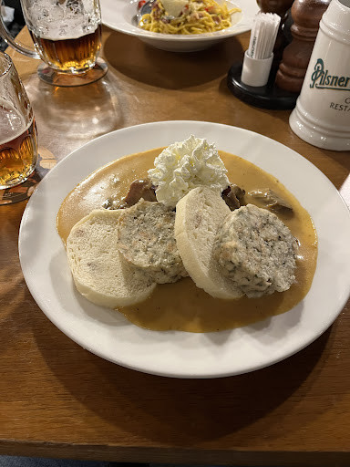We ordered our meal, which included an order of potato pancakes. A little while later a dish was dropped off at our table that was clearly not potato pancakes. It was a soft tortilla wrapped around slices of meat. When I was finally able to get our server's attention, I let him know that someone else's dish was dropped off at our table (thinking that someone was missing their order). He said that we ordered the potato pancakes and I said "yes". He said these were the potato pancakes and I responded that I thought we'd be getting the fried potato ones. He said that's what we got. Dumbfounded, we went ahead and ate it. At this point, I also noticed the 3 Czech gentlemen next to us kept looking at our table and laughing, so I started to suspect something was up. (This was later confirmed on our bill.)