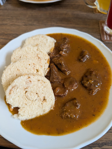 Read morei know we should have drunk more beers 😆 but honestly our aim was food, and for both i recommend the place a lot! you can see locals but also tourists as it's a great place for tasty czech food. as you can see i didn't manage pictures before things were getting eaten. the tartar with fried bread is great and the sauce for the braised pork also a real delight! just a small note to maybe explain the type of dumplings accompanied the dish in the english menu but if you ask the staff they will for sure explain (the menu just says dumplings). other than that - great atmosphere - the staff was very kind to look for a table for us (was full) so we decided to stay on the side with great beer they have and no more than 20 mins we had it. if you don't wanna wait i recommend coming later hours like 8pm. the staff is very polite and english speaking....
