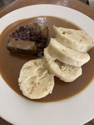 Hovězí svíčková na smetaně (Beef sirloin in creamy sauce with bread dumplings and cranberries) An iconic Czech dish done right. The beef was incredibly tender, bathed in a rich, smooth cream sauce infused with root vegetables and a touch of sweetness. The soft bread dumplings were ideal for soaking up the sauce, while the cranberry topping added a refreshing tang. This dish captures the essence of comfort food with elegance.