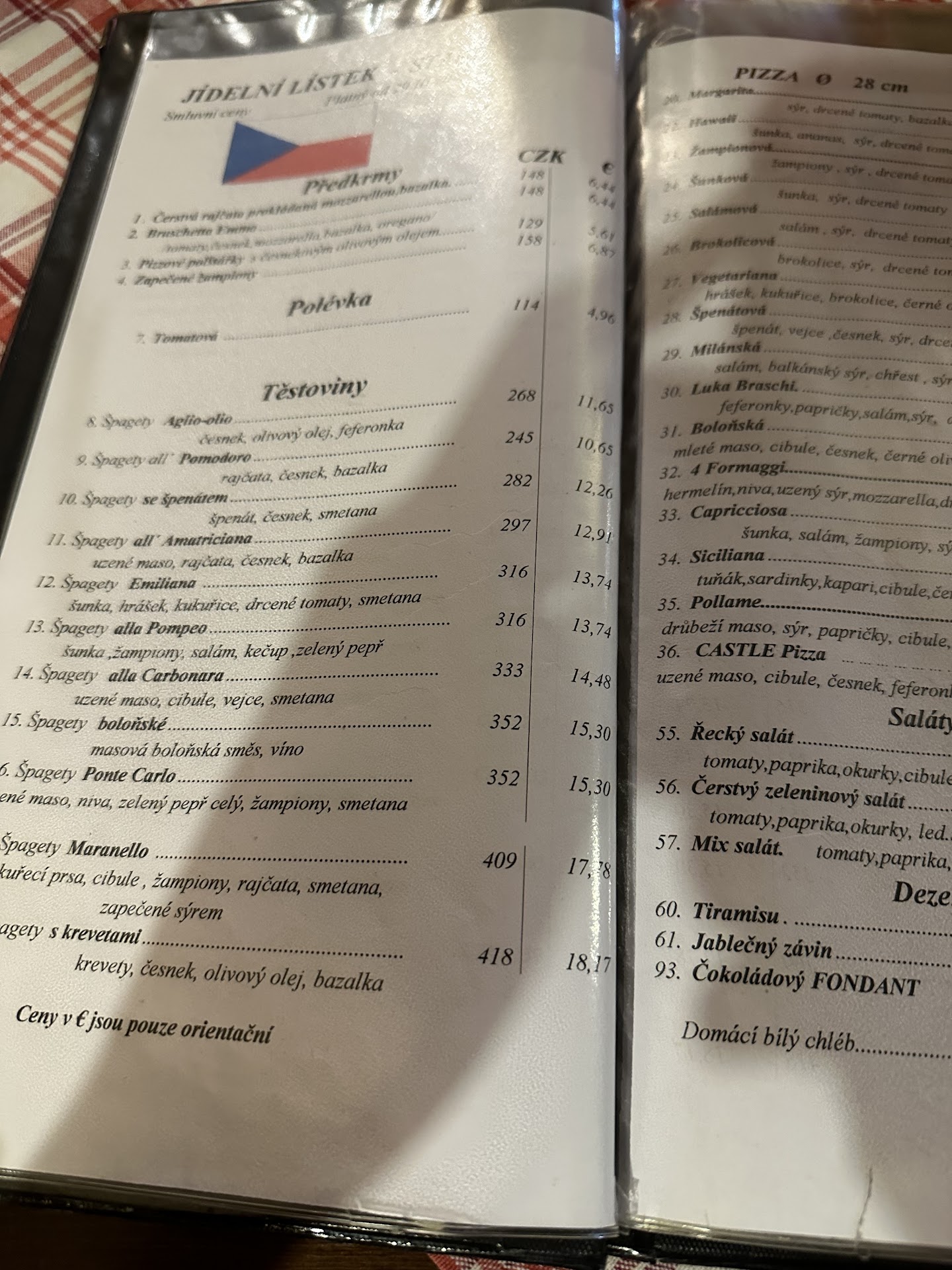 Excellent pasta and pizza, we had the pizza Lucha braschi (w chicken) spinach spaghetti and the amatriciana spaghetti with chicken (which the host was happy to change from salami) ... one of the best pasta in Prague or even other countries I have tasted I must say! Happy w service as well... host was good to offer chicken instead of beef or pork so that made many choices possible for us! Kids enjoyed the hot chocolate (nice and creamy!) and we the beer...! We also had the tiramisu which was the icing on the cake!