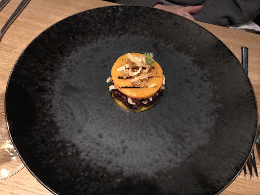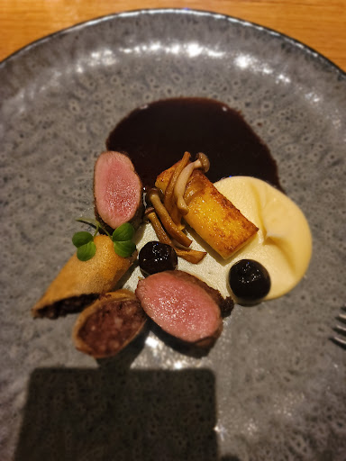 We had the five course tasting menu with the wine pairings. We chose wine pairing A, which is the less expensive of the two options. All of the courses and the wines were excellent. My favorite course was the second course, the duck liver fois gras pate. A few comments on some of the wines. The prawn course comes with a pinot grigio. Usually I’m not a fan of that wine because they are typically too light. But the one served here had lots of body and was surprisingly good. The pate course comes with a hibernal. The traditional pairing with pate is a sauterne, which is sweet. However, the hibernal grape is a cross of two grapes, one of which is riesling, and that gives it some sweetness so it went well with the pate. The third course, a red fish filet, comes with a white rioja. This wine is an inspired choice because it is full bodied but yet does not overpower the fish. The fourth course is duck breast, and it is served with a cabernet sauvignon. I thought this wine would be too powerful for the duck, but it turned out to be a rather light, but flavorful wine that worked well. Our server/sommelier explained that the colder central European climate in which it is grown makes the cabernet less powerful than the Napa cabs I usually drink. He was very enthusiastic about the dishes and about how the wines paired up which greatly added to our experience. A wonderful meal, I highly recommend...