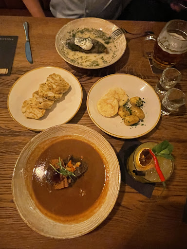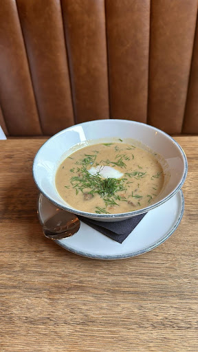 We ordered the "Konfitované žebro," "Kulajda s houbami," and "Tatarák z hovězího." The soup was outstanding, unlike any I’ve ever had, with mushrooms that took the flavor to another level and a Benedict-style poached egg that added a unique and delightful touch. The presentation was also impressive, as shown in the photo, where the soup looked as good as it tasted.