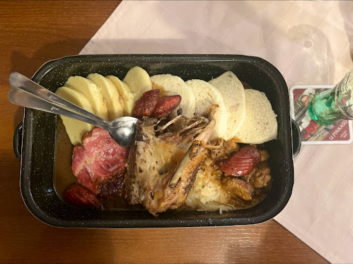 Food: portion wise it was just enough for light eaters. As shown in the picture we got 2 whole sausages cut into halves, pieces of pork neck and some thin slices of something I can’t remember Over a bed of red and white cabbages With two types of dumplings (potatoes and bread type) I have never given any food as 1* in my life so far!! But this one!! Meat was too salty!! to a level you can’t eat more than 5-6 spoon full. Ok you can adjust the salt eating with dumplings but those dumplings were equally bad!! I wish they could have just served boiled potatoes instead of wasting them in making dumplings. It was simply tasteless!! I ate one piece and had to leave the rest 4pieces of those potato dumplings!! I could be wrong if those were not potato dumplings but something else!! It is unrecognisable. The soft bread type dumplings were the only good thing in this whole casserole of food. And i am not comparing food just out of the blue!! I have eaten similar food in cesky and kutna as well so i know what a good dumpling taste like.. i know how the meat is seasoned perfectly.. and i know how the cabbages should taste like in czech cusine. This place just disrespected the food.