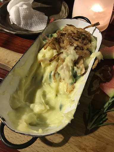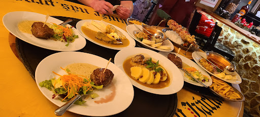 Where to start...We should have known it was going to be bad when the greeter was dressed as a medieval knight. At that point we still had the chance to run but opted for the nice atmosphere with outdoor seating. The feta salad was good, the goulash soup was decent but under seasoned. My girlfriend enjoyed the bread once she got the butter, but this seemed less exciting in retrospect when we received the bill which included a butter charge X2. The sausages with sauerkraut were okay but then again Farmer John brand which I make for breakfast taste about the same for one quarter the cost. My beef rib was tender although very fatty but was accompanied by what appeared to be baby food potatoes with spinach. Picture included below. Yikes. All this excitement was topped off with a fire show where the girl lost the fire stick and burned an unsuspecting patron a few tables over from us....now that I think about it, I'm sure our experience was better than that poor lady's who now has a half burned white coat. All in all, the food was overpriced for authentic Czech cuisine. If you're looking for something good to eat, walk about a block over and eat at Bredovsky Dvur. It's authentic, delicious, reasonably priced and lacks the fire...