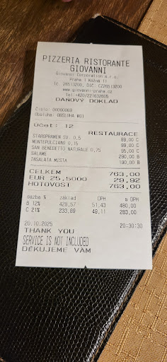 We had a disappointing meal here on the 21st July this year. Maybe it was a mistake getting a pizza in Prague, but the restaurant and it's food looked nice, as we walked past. When we sat down, the male water came and "cleaned" our table. This involved running a paper serviette over a very sticky outdoor table. When bits of the serviette tore off and stuck to the table, he just picked them off in front of us. Classy! The pizzas took a while to arrive and looked great (I had ham and mushroom, my friend had veggie/ mushroom, but they were very bland. Couldn't taste the cheese at all, and hardly any flavour. But we were in a hurry so we ate them. The best bit was when the waiter brought the bill and the card reader. The bill came to 604 CZK, but the waiter keyed in 670 saying: "604 add 10% is 670, ok?" "No" my friend said; "604!" "Yes sir, but with 10% service charge its 670." he replied, offering my mate the card machine again. "No, 604!" my friend replied. At this point the waiter's attitude changed, he re-keyed the price of 604 with a dirty look on his face, didn't say another word and marched away. We both happily give tips when we get good food and good service, but at Wine & Food by Giovanni (very imaginative name), we got bad food, slow service, rude service but at least the beers were nice! Well I suppose, beer is not brewed there, so that...
