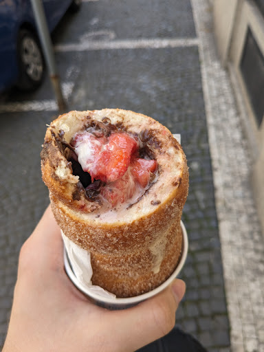 This is my first and maybe only Trdelnik, this review is for everyone who hasn't had one before. The takeaway is that the pastry is more difficult to eat than they look and there is no bottom. I kind of imagined a soft bread cup with strawberries, Nutella and ice cream in it. In reality (at least the one I got) the bread part was hard and you need to spiral your way down unless you want Nutella on your nose, but then when you're about to finish eating you have a paper cup in the way. I tried lifting the Trdelnik up, realizing all the chocolate and strawberries fell down to the paper cup. So now I'm using both hands to hold up a single pastry.