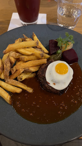 The steak haché was cooked to perfection—juicy, flavorful, and beautifully presented with a sunny-side-up egg on top. The rich, savory sauce accompanying the steak added an extra layer of depth to the dish, complementing the meat’s robust flavors without overwhelming them. Paired with crispy, golden fries and a side of pickled vegetables and beets, the meal was a perfect balance of taste and texture.