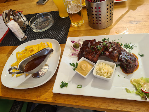 Read moreIch war heute Mittag mit meinem Töchterchen hier Mittagessen. Der Service ist sehr freundlich, aufmerksam und schnell in der Bedienung. Auch mussten wir nicht lange auf unser Essen warten. Ich hatte Rippchen in Schwarzbiersoße für 349 Kronen ca. 14,35 Euro und Pommes 69 Kronen ca. 2,85 Euro dazu bestellt. Die Rippchen waren gut...das Fleisch sehr zart und lecker aber leider mehr Knochen als Fleisch. Die Schwarzbiersoße fand ich auch sehr gut. Die dünnen Pommes...naja...für 2,85 Euro aus der Fritte auf den Teller?! Schon happig Alles in allem war das Essen gut aber für 17,20€ im Preis Leistungsverhältnis meiner Meinung nach nicht so überzeugend. Deshalb leider...
