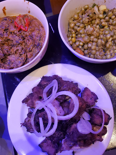 There were 6 of us for dinner and we had a private room in the lower level, so no windows. It was comfortable with lounge seating. I had roast pork that was well cooked, with petit pois (green peas) prepared with legumes, very tasty, and mbika - pumpkin seeds cooked in palm oil, mashed, with one fiery habanero. My wife's grilled tilapia was prepared nicely and her frites (fried potatoes) were served African style with mayonnaise and a hot chili sauce instead of ketchup. I'll go back to try...