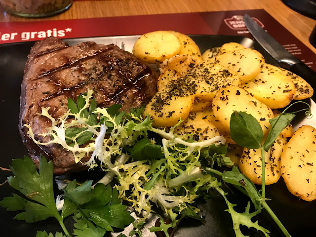 We came here with a group of 8 looking for dinner and honestly did not expect much. All chain restaurants I've ever been to had mediocre food and service at best and usually felt pretty crowded. However I was pleasantly surprised. We got a nice table overlooking the restaurant from above and the food was actually good. Both the steak (perfectly medium rare) with potatoes and Belgian chocolate cake were delicious. The service was by far the best I've seen during our Denmark vacation with a waiter actually checking from afar if our glasses are empty and not coming running every 5 minutes to ask if we want something or forgetting about us altogether. Our large orders were delivered quickly with our first round of drinks being there within less than 5 minutes. It's also worth noting that the servings are already big sizes, but if you want more you can get refills on sauce or potatoes/fries.