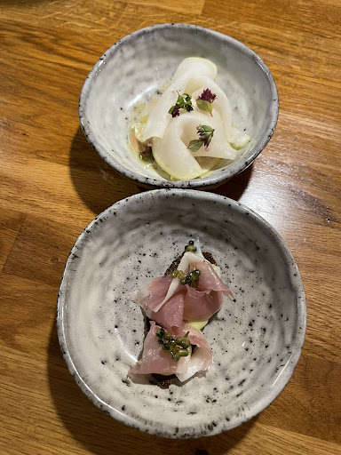 A warm, malty sourdough bread arrives alongside water as soon as you're seated, setting the tone for what feels more like a conversation than a meal. And it’s in the small things that this restaurant speaks most clearly: the napkins are the softest I’ve ever touched, yet also the most wrinkled. It’s not carelessness – it’s a statement. Comfort is chosen over cold perfection, intimacy over polish.