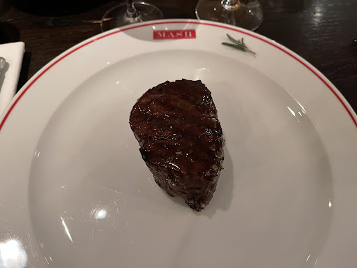 Det kød vi (2 ud af 4) bestilte var ikke at anbefale til andre: der var fedtknuder og sener i kødet og smagen var Ikke som vi forventede. Ikke en oplevelse jeg vil anbefale andre. De andre 2 i vores gruppe var OK med det kød de havde valgt, men ikke imponerede som de efterfølgende sagde. Jeg håber på at vi har været uheldige og jeg planlægger derfor endnu et besøg som gerne skal ændre min opfattelse af stedet.