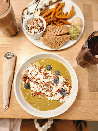 The scene is more cafe than restaurant, with a very fresh and clean vibe. They have a great selection of vegetable juices and fruit smoothies, as well as some a la cart options that can easily be ordered for a quick bite "on the go".