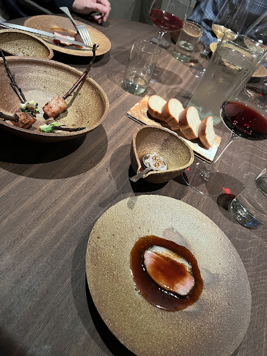 Ambiance: 1/5 We were received by a charming and smiling waiter at the door and led into a backyard with a nicely done-up garden and a very fancy door leading us inside. This felt perfectly executed and kicked us off well. However, the interior felt unfinished and sterile, lacking warmth and personality. The décor was minimalistic to the point of being bare, with wires hanging from the ceiling that hadn’t been connected and a reception area with no windows and poor lightning that made you feel like you were stuck in a cave. We were moved into this area at the end of the meal in a manor that felt forced and unwelcoming. Here we found a menu with options to make additional purchases. Instead of feeling like a natural progression of the experience, it felt cold and as though the very high price point wasn’t enough, and more money needed to be extracted from us. This was the biggest disappointment.