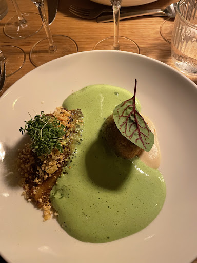 Writing this as a heads up to everyone that expects a calm, elegant dining experience. It felt like we're on a cruise ship and not in a good way. Everyone is let in at the same time, meals are served at the same time (which is interesting but also makes you feel like you're at some conference or in school), but most importantly there's an open bar. Which in theory - sure, but in practice that means things start to get rowdy by the end of the second course (out of 5). It also seems to be the only place in Copenhagen where some staff is not fluent / comfortable in English which sometimes results in your table being forgotten. If you're into unlimited cheap wine and extremely average food, go for it. But it absolutely does not deserve a 4.7 star compared to other highly-reviewed restaurants, especially...