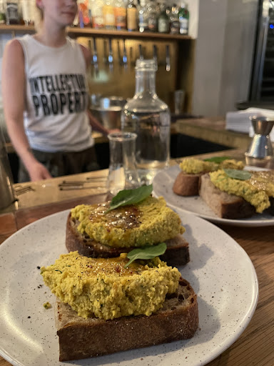 What a lovely bar with original cocktails card. They may seem to be familiar to you by a name or content, but believe me, you don't expect a twist that awaits you. The very lovely pal bartender has brought the quite standard cocktails to perfection. Hence it is almost an empty glass on the photo as it was undertaking to stop for a quick pic once I got this godlike salted espresso martini. And the ace basil has stolen my heart - I am afraid I won't be able to drink any other gin-based cocktails after this one as they are far below the set bar now The vibe is super friendly, guys who work here are chatty and welcoming :) Besides amazing cocktails one can find something for a quick bite like different mezes and snacks. I'd definitely recommend coming here with friends or alone - doesn't matter - as you'll have good time here anyway. Oh, now I need to plan my next trip to cph to come back to this...