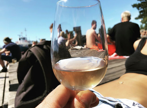 There happened to be one mackerel left—grilled to quiet perfection, touched with a salsa just shy of sin (I’m Mexican, so heat is a birthright, not a preference). The structure of it—beautiful. Oysters, ocean crispy fresh. A chilled red wine that didn’t care about rules. And then the sunset is arriving, with birds skimming the water like a Nordic omen.