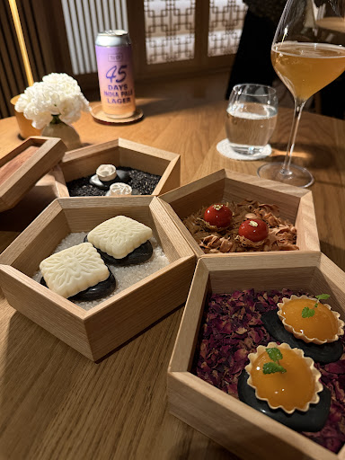 Dinner at Koan was a pleasant experience. The location is great and the restaurant's interior is beautiful. As soon as we stepped in, the staff started taking care of us, and that continued throughout the evening. We chose the non-alcoholic sparkling elderflower drink for the first bites, and one non-alcoholic and one hybrid non-alcoholic / sool pairing. I was very happy with my non-alcoholic pairing, which I think was as interesting as the food. In terms of food, most dishes were interesting, delicious, or both, and there was more than enough food. My favourites were the tofu & caviar, oyster & king crab, and the "oolong tea and good memories" dessert. I didn't like the Sun dae, but I don't like blood pudding in general, and I found the yuzu dessert overpowering, even though I normally love yuzu. Throughout the evening, I could definitely appreciate the consideration and care that went into designing and making every single dish. Overall, I can recommend Koan as a high-end restaurant, and I felt like the value for money was reasonable. There were as many staff members as guests. Perhaps what I liked most of all was that the atmosphere was relaxed and warm and we got lots of information not only about the food and drinks, but also about the dishes that were used for serving...