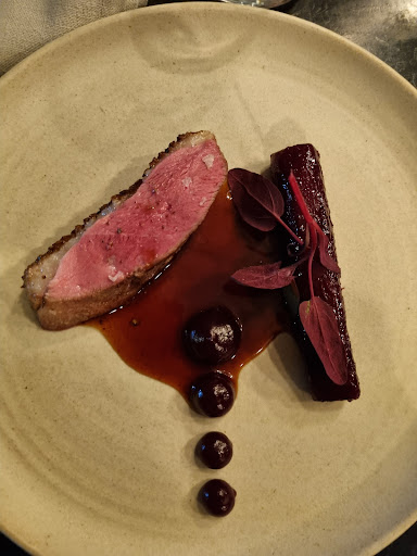 Course 3: Halibut. Visually impressive but overwhelmingly salty. While we’re no strangers to seasoning, this was excessive. The fish itself was good and the grilled elements added nice depth, but the large chunks of spring onion were difficult to cut, forcing you to eat them whole. The wine pairing helped cut the saltiness slightly but wasn’t enough to redeem the dish.