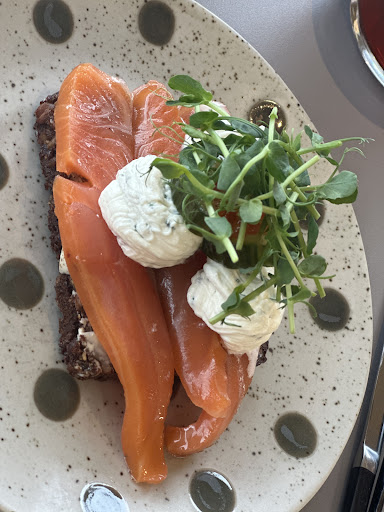 The food is undoubtedly the highlight. We were served four different pieces of smørrebrød: cold-smoked salmon, baked pumpkin, tartare, and chicken salad. Each piece was a delight for both the eyes and the palate. The cold-smoked salmon was silky and perfectly balanced with fresh and tangy elements, while the baked pumpkin added an exciting, sweet, and slightly spiced twist to the classic smørrebrød. The tartare was beautifully presented with an ideal balance of spices and textures, and the chicken salad was creamy and flavorful, topped with crispy elements that provided a delightful contrast.