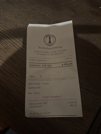 To make matters worse, the bill we received was different from the amount we were actually charged — water was added afterwards directly on the card machine without updating the receipt. (Please see picture attached for transparency from our side) - I am collecting the screenshot of our bank statements to prove that the amount paid is different than the one on the receipt and I will attach as soon as I can. In total, we paid DKK 5,157 (almost €700), far more than we had planned.