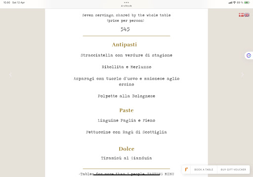 We booked a table for nine people by phone and were never told that groups of five or more are forced to take a fixed menu (around DKK 550 per person - around €75 per person). Once seated, we were given no choice but to accept it and we were told that we could have checked online. (This info wasn’t shared on the phone [ we booked over the phone, so the info should have been shared by phone. If we had booked online, we would have checked the info online].