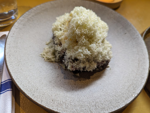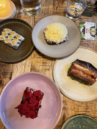 Now onto the food, we took 3 Smorbrod each to share. The first three was the fish course and that was super tasty. Beautifully presented , like art. The waiter often poured some brown butter on everything with took to the next level. After eating the first 3 we received the next 3 , and at this stage it felt like a little too much bread as there is a thick slice of bread on every course ( of course there is , its smorbrod after all), the next 3 was a little less nice.
