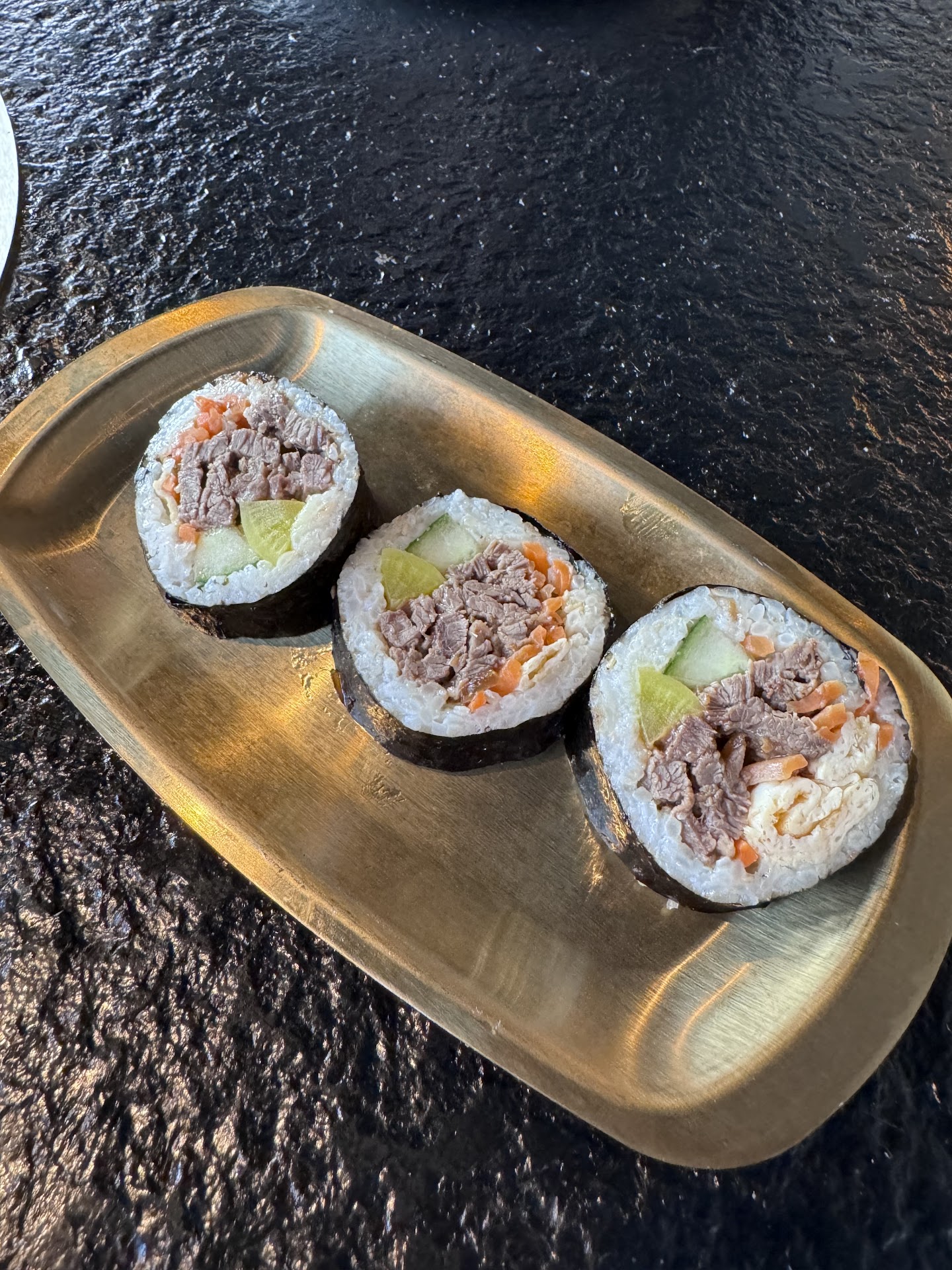 All banchan ordered had no flavor and were quite bland. Japchae could have used a little more soy sauce. Jasmine rice was served and it was dry. Short grain should be used and soaked before steaming so it is slightly sticky. A rice container with a lid is optimal to keep the rice moist and warm because you are taking time to grill the meat. Only the gimbap was good and I can’t be certain because after waiting so long I was ravenous. They say hunger is the best sauce!