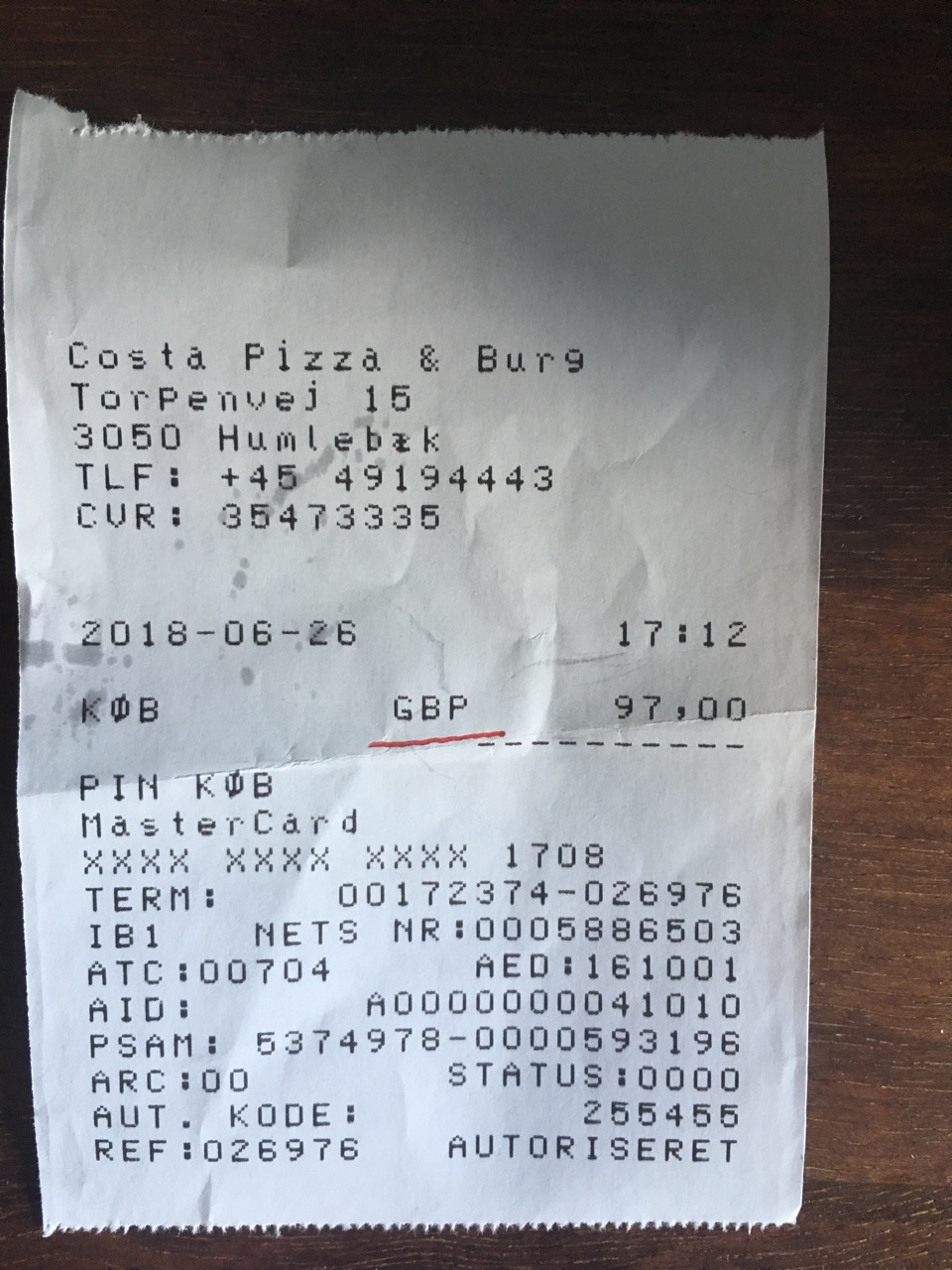 Don't visit this place! I was very unlucky to have a meal in this cafe - I was there on June 26th and ordered Shawarma Ret (75 DKK) + a beer (22 DKK), so together it was 97 DKK but a waiter charged from my card this amount not in DKK but in GBP (!) which is 8,5 times higher!! When I paid the bill I did't pay attention to the currency because you really don't expect to be charged in GBP in Denmark. I realized the mistake only few days later when I checked my back account and already left Denmark. I called to Costa Pizza & Burgerhouse to explain the situation and asked to fix it but had very unpleasant conversation with the employee who answered my call. He said that I'm a liar and didn't want to understand the issue at all. It's really awful how this place treat the customers and the fact that they didn't even give me a correct email address to send the bill (email address which they have on the web site doesn't work at all) and confirm their mistake gives me a reason to think they made this mistake on purpose.