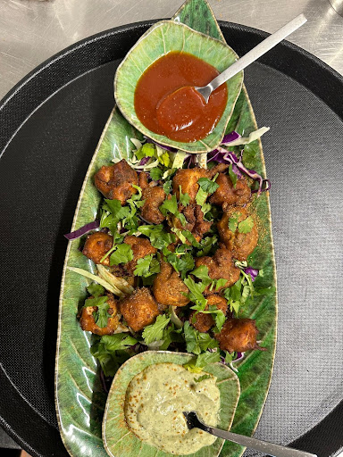 Samosa (1 stk.) Sprød trekant formet med fyld af let krydrede kartofler og ærter. Serveres med Myntesauce og BBQ sauce. Samosaen er dejligt krydret, med en lækker blød indre konsistens, med kontrast af den let friturestegt ydre dej. For mit vedkommende er det 5 ud af 5.