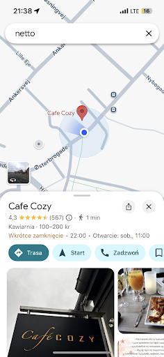 Værst af alt og uden sidestykke var dog den ualmindelig ubehøvlet indehaver. Han ignorerede os da vi kom, og svarede surt da vi henvendte os til ham. Aldrig før har jeg oplevet at stå og vente pænt på at ville købe dyrt saft og så blive ignoreret, vrisset af og tvært blive spurgt, imens han havde ryggen til mig, "hvad jeg manglede" efter at han havde ignoreret mig og været umulig at få øjenkontakt med i længere tid. At ignorerer kunder og tiltale dem flabet når de kommer og vil bruge penge i hans café giver absolut ingen yderligere besøg af mig. Hvis man ikke kan behandle kunder ordentligt fordi der er travlt er der andre brancher der er bedre.