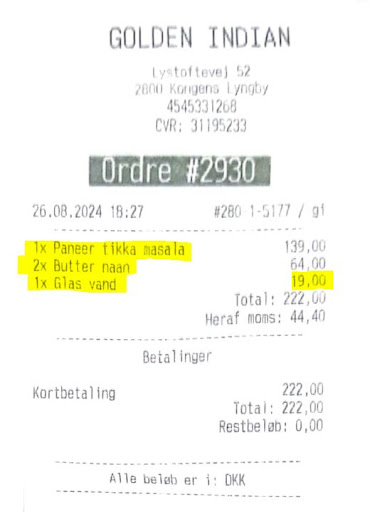 Read moreWorst Indian food I ever had. Ordered Butter Naan and Paneer Tikka Masala on 26th-August. When ordered delivered was shocked to see that Naan was made of Maida and not a 10% of whole wheat flour was used. Next come to Paneer Tikka Masala. Gravy was almost red, and when I tasted it felt like it has cooked in tomato catchup. As a Indian I can say it's a shame on the name of Indian food. Also forget about any onion or pickel, when I specifically asked about to serve normal tap water (as in Denmark it is considered safe to drink tap water)at the end, tap water was served in one glass (no bottle nothing which is ok) but at the end in bill 22 kr. has been added for one glass tap water without mentioning earlier.