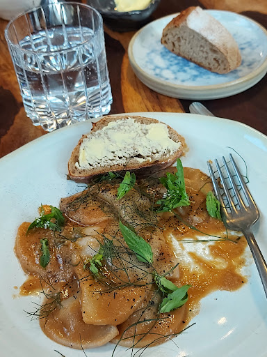 Read moreThis fine dining restaurant was busy with diners today, little wonder as the Christmas Market was on. We were offered a table in the bar where they serve snacks. We ordered seaweed with dried herbs and almonds with sea salt, followed by an oat ravioli with confit of mallard and an onion glaze all decorated with seaweed. It was a taste sensation: the almonds had a delicate flavour of salt and herbs, while the seaweed was crispy and strong in flavour but delicious. The flavour of mallard was not overpowering, but as delicate as the oat casing wrapped around it. The onion glaze was well matched and I couldn't resist wiping my plate clean with the rustic bread also made on site. It wasn't cheap, but the experience matched the number...