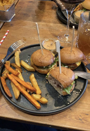 Mad: Burgerne var efter min smag lidt bedre end andre burgere i Rødovre. En udmærket burger med fin smag. Ikke noget ekstraordinært men fint, pænt og flot anrettet. De brede fritter var lækre, perfekt stegt. Nuggets til børnene var også udmærkede, de så lækre og friske ud og fritterne var sprøde og lækre.