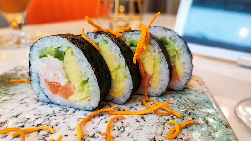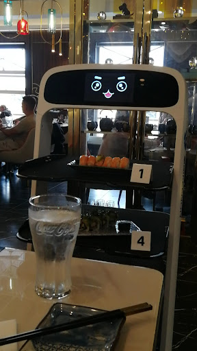 Lækker mad og spændende oplevelse med at bestille sushi over tablets og få leveret med robot. Der var børn ved et af nabo-bordene, der havde en fest med at bestille og sende robotterne retur. Robotterne er 'søde' da de har skærme med ansigter og giver forskellige emoji-inspirerede udtryk. Man kunne smage at maden er lavet af professionelle sushi kokke. Den var super lækker og smagfuld. Stedet er flot og moderne indrettet og dampmaskinerne ved dessert-buffeten, der skal holde maden frisk, giver restauranten et næsten futuristisk udtryk. Jeg har givet to stjerner for service, da vi ikke blev modtaget ved døren, men skulle gå til disken. Det var ikke meget smil, så det føltes som om vi var lidt i vejen, og vi fik at vide at vi bare kunne sætte os ved bord nummer 1. Vi måtte gætte os lidt frem hvor det var, da vi ikke blev fulgt dertil. Jeg måtte tilbage til disken igen, da der kun var dækket op til to personer og vi var tre, hvorefter de kom med med en ekstra opdækning. Vi fik ingen instruktion i hvordan man bestiller, men måtte regne den ud selv. Under bestillingen glemte de at sende nogle af de ting afsted som vi bestilte, som vi måtte rykke for. Så servicen er klart et punkt der kan forbedres. Det var dog stadig en god oplevelse og jeg er frisk på at komme tilbage en anden gang, om ikke andet for at finde ud af om vi blot var uheldige med kundeservicen...
