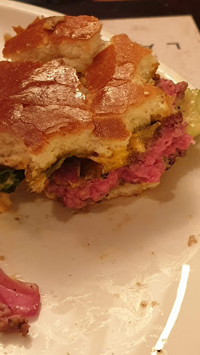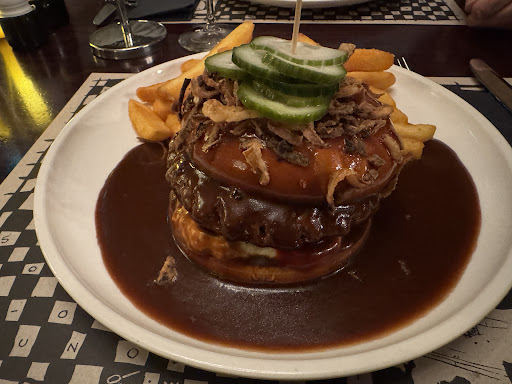 Idag er vi nået til Resturant Latinerly i Viborg som skal have testet deres bøfsandwich m. Sovs. Vi ankom klokken 12.50 til et bord bestilt til klokken 13.00 og blev straks vist til vores bord i den pænt fyldte resturant. Vi afgav ordre klokken præcis 13.00 og maden blev serveret ved bordet præcis 13.15. Maden ser ved første øjekast appetitlig ud og fremstår pænt på tallerken sammen med de lækre gigant pommes, når dog lige at tænke det er dæleme mystisk med de syltede agurker på spyddet, de hører da til inde i bøfsandwichen og der er dæleme ikke meget sovs. Bollen er en standard brioche bolle og den smager som den skal. Overbollen er smurt med en alm Dijon sennep som lige kratter lidt i ganen, den er desværre helt sikkert præfabrikeret. I bunden finder vi lidt remulade som jeg er ret sikker på er hjemmerørt og den smager dejlig, der er også en anelse ketchup som man lige aner. Man finder derudover hjemmelavet bløde løg i fin mængde som smager skønt og af syltede varer er der rimelig massive hjemmesyltede rødbeder som smagte verdens klasse, det var så de smeltede i munden, og de hjemmesyltede agurker som var faret vild på toppen af brødet smagte også vidunderlige da de fandt vej ind i dybet. Særdeles hæderlige syltninger er de sluppet afsted med. Oven på bollen fandt man også hjemmelavede ristede løg som ligeledes smagte skøn og fin velbalanceret smag. Bøffen er en vel nok 200 grams hakkedreng der smager ganske skøn, den er medium stegt som vi kan li det og den er perfekt krydret. Den kunne godt have taget lidt mere stegeskorpe, altså være stegt lidt hårdere, men den var medium og dejlig så tak. Sovsen var et helt kapitel for sig selv, nøj hvor englene sang, den smagte fantastisk ja faktisk smagte den så skøn at vi måtte bede om noget mere. Den sovs er verdensklasse. Tak. Til bøfsandwich fulgte fin mængde gigant pommes som var virkelig sprøde udenpå og helt mushy indeni. Virkelig gode. Vi gav kr. 109.- som mandagspris (andre dage koster den kr. 169.-) og det er en konge pris for dette måltid, det er velsmagende, flot anrettet, størstedelen hjemmelavet og den skal have 4,5 ud af 5 stjerner. Vi er ikke helt oppe i superligaen men 1 division kan nu også noget. I stedet for det Dijon sennep savnede jeg en kompot eller relish , samt lidt hårdere stegt bøf. Men absolut et håndværk I kan være stolt af. Vi kommer gerne igen....