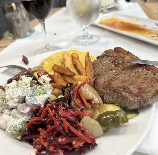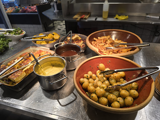 We came a bit late for dinner, and the staff was very welcoming and fast to explain the VERY over complex drinking ordering system and how the token works and further that you can order meat from the counter as an addition to the buffet. The buffet selection was not big nor small, and all the servings seemed quite freshly made. Good tasty salads, nicely made potatoes and fries. Bread was definitely on the dryer side. They were serving two different sauces, bearnaise and brown gravy, a bit bland taste; I believe they came from a bucket.