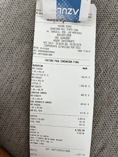 Pedi el combo del barco 2 mil pesos dominicanos equivalente a unos 40$ incluía una jarra de sangría (De alcohol barato… Okey, Nice, aceptable). El barco traía sushi solo de arroz!!!!!! Encendí la linterna de mi móvil para alumbrar cada rollo porque no lo podía creer. Ningún roll traía nisiquiera aguacate, unos de los principales frutos de la República Dominicana!!!!!!!!! 40$ una cuenta que aún no tenía el 10% de servicio, más impuestos, mas no se que más le suman. Porque le suman hasta el aire que respiras. Quizás la cuenta final hubiese quedado en unos 50$ por un barco lleno de arroz. Me pongo en el lugar del empresario y se que debes buscar la manera de abaratar costes. Pero se le fue de las manos. Es un robo descarado, es ridículo, es INEFABLE!! Si quisiera comer arroz cocino en mi casa!!! El seguridad de la puerta tiene que relajarse. Soy turista, RD es un lugar caribeño. Es Ovbio que iré a los lugares con ropa cómoda. Amiguito tienes que ubicarte, solo mira a tu alrededor…. Para flipar!! Estoy llamando a mi agencia de viaje…Solo quiero tomar un avión y volar lejos de yoshi...
