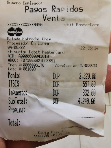Our server was very nice, though she didn't speak English, which is very common in the DR. We were prepared and she patiently worked with us to understand our broken Spanish. I also used the Google translate function on my phone, which worked well. Unlike what other reviewers stated, we were still charged the 28% tax (10% and 18%) even though we paid in cash. We really couldn't complain though, because we only paid a total of $63 USD for an appetizer, 4 drinks, and 2 entrees. We left our server an additional $15 tip because I read that the 18% hospitality tax they charge in DR usually doesn't make its way to the servers.