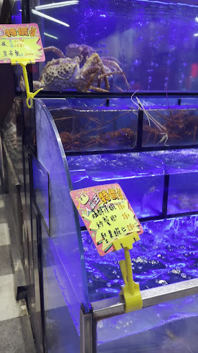 Read more第一次在海產店吃帝王蟹,因為是被請客不太清楚螃蟹的價格,建議還是到店裡問一下價格比較好。店門口的魚缸有許多新鮮活跳跳的海鮮,價格都有清楚的寫在上面,價格都是滿透明化的。 內用的話白飯是免費供應,如果要外帶一碗是10元,不過當天因為過年期間餐廳人很多,請店員是否可以直接給一大碗,店員說一個碗要多收100元,第一次聽到有餐廳這樣的收費滿奇特的。 除了熱炒之外也有許多冷盤的小菜可以點。菜單的部分也是琳瑯滿目可以選,冷盤、生魚片、熱湯、炸物、烤物等等的,價格最便宜一盤只要100元起。也有一些菜單上沒有的新品,龍虎斑現在促銷點一尾就送兩道熱炒。