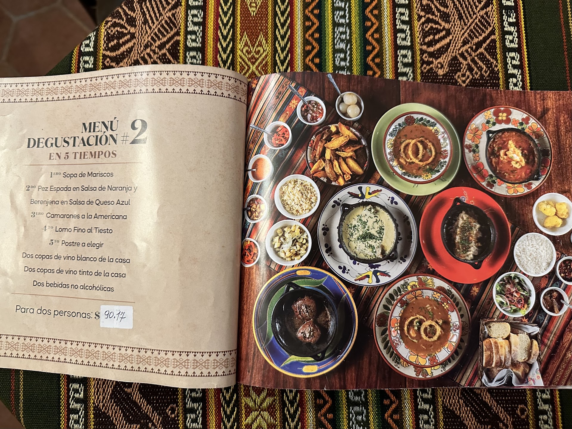 What an amazing dining experience! I researched a number of restaurants to try while in town for four nights, and this was the last one we went to. I made reservations by stopping by the restaurant during the early afternoon and was somewhat surprised to find that the place was packed. No empty tables through the several rooms that were visible. Reservation for the evening in hand, we returned just after they opened back up after their late afternoon break. We were given the menu, which is like a magazine/brochure/guide as it takes you through a nice photo presentation of meat, fish, vegetarian, soups, etc. Then, there are five set tasting menus to choose from, each one containing dishes from the previous pages. It was fun looking at all the options, which were available a la carte for two or more people, and deciding on a menu. Our waiter, who was awesome, recommended for the first time we try menu #1, which includes the shrimp soup, langostinos, filet in cream sauce, and chicken curry as mains. Aside from the main dishes, there are a number of sides that are provided and there was bread and six different sauces (a spiced pineapple, spiced apple, chimmichuri, eggplant, ahi- standard mild Ecuadorian hot sauce, hot chili sauce, and something like mild pico de gallo). The sides included French fries, boiled potatoes, a semolina dish, a small green salad, some small white tubers that kind of tasted like beets, and rice. The rice and semolina were incorporated into the sauces left in the smoking hot cooking dish, a “Tiesto”, that the main dishes arrived in.