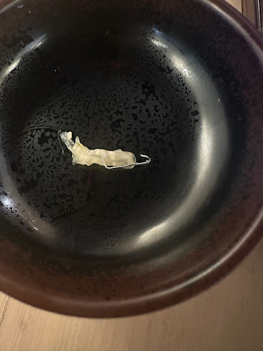 THIS WAS FOUND IN MY HUSBAND’S RAMEN! WE CALLED A WAITER AND WHEN HE CAME TO OUR TABLE. HE LOOK ANNOYED AND COMPLETELY RUDE TO MY HUSBAND. DID NOT EVEN APOLOGIZE FOR THE INCONVENIENCE THAT HAD HAPPENED. MY HUSBAND WAS JUST RECENTLY ADMITTED TO THE HOSPITAL BECAUSE OF HIS THROAT AND IMAGINE IF HE HAD SWALLOWED THE THING?! VERY POOR CUSTOMER SERVICE COMING FROM THE GUY WAITER!!!! WE WILL NOT DINE...
