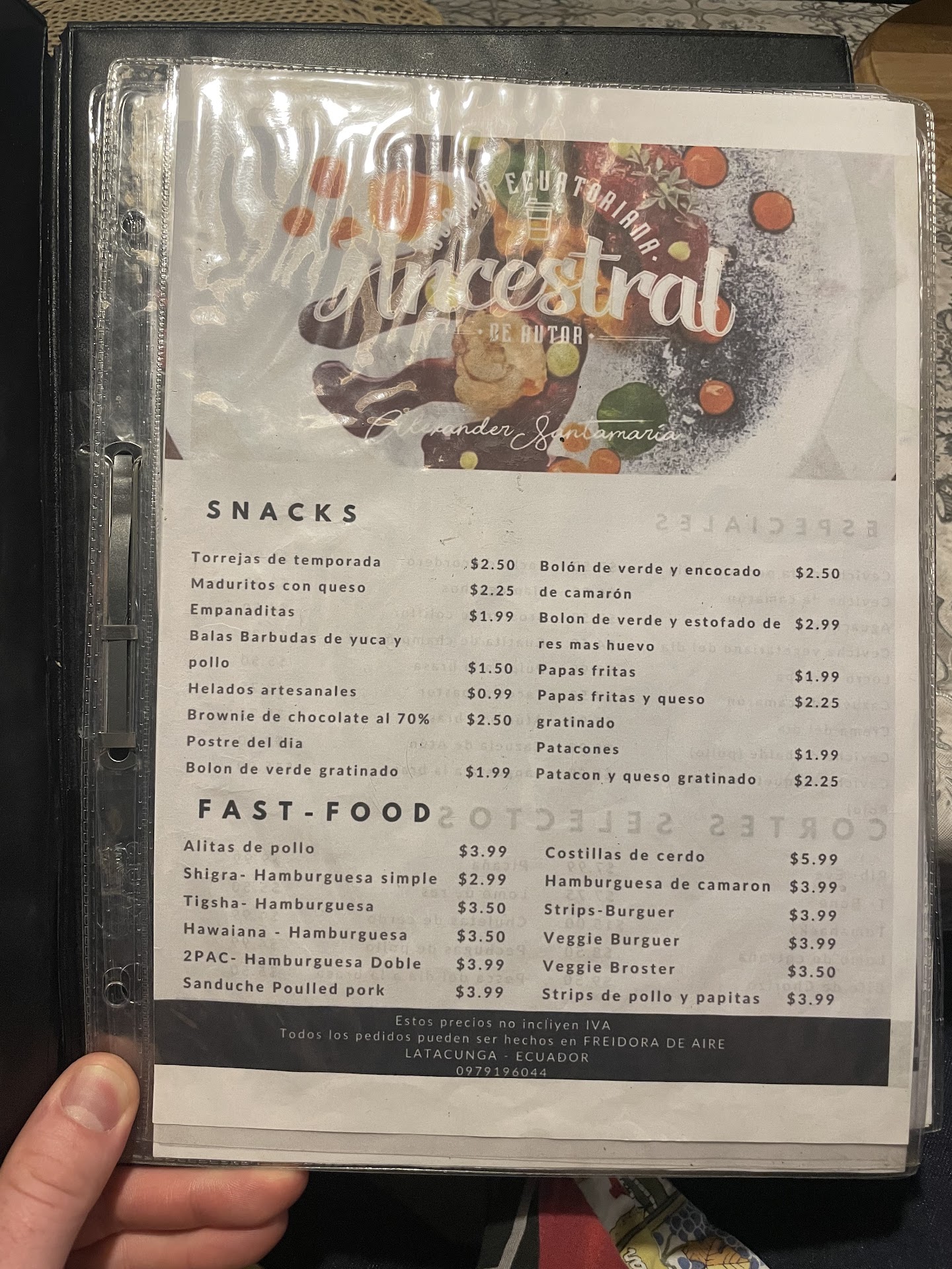 Read moreEn visitant Latagunga, nous passons devant cette devanture originale et l’annonce d’une cuisine équatorienne d’auteur. Nous y sommes revenu le soir, un accueil très chaleureux, une petite salle à l’étage , une cuisine ouverte avec le chef aux fourneaux. La carte est très simple avec les plats de la gastronomie équatorienne et quelques burgers. Nous prenons un ceviche de crevettes et un ceviche de poisson, les assiettes sont une merveille de présentation et de goût. C’est parfait. Je demande si il y a des desserts car ce n’est pas sur la carte et la serveuse me propose un tiramisu fait maison qui est excellent. Belle carte de cocktail dont un mojito aux fruits rouges excellent. Un rapport qualité prix imbattable. Amis touristes français ou autres ne loupez pas...