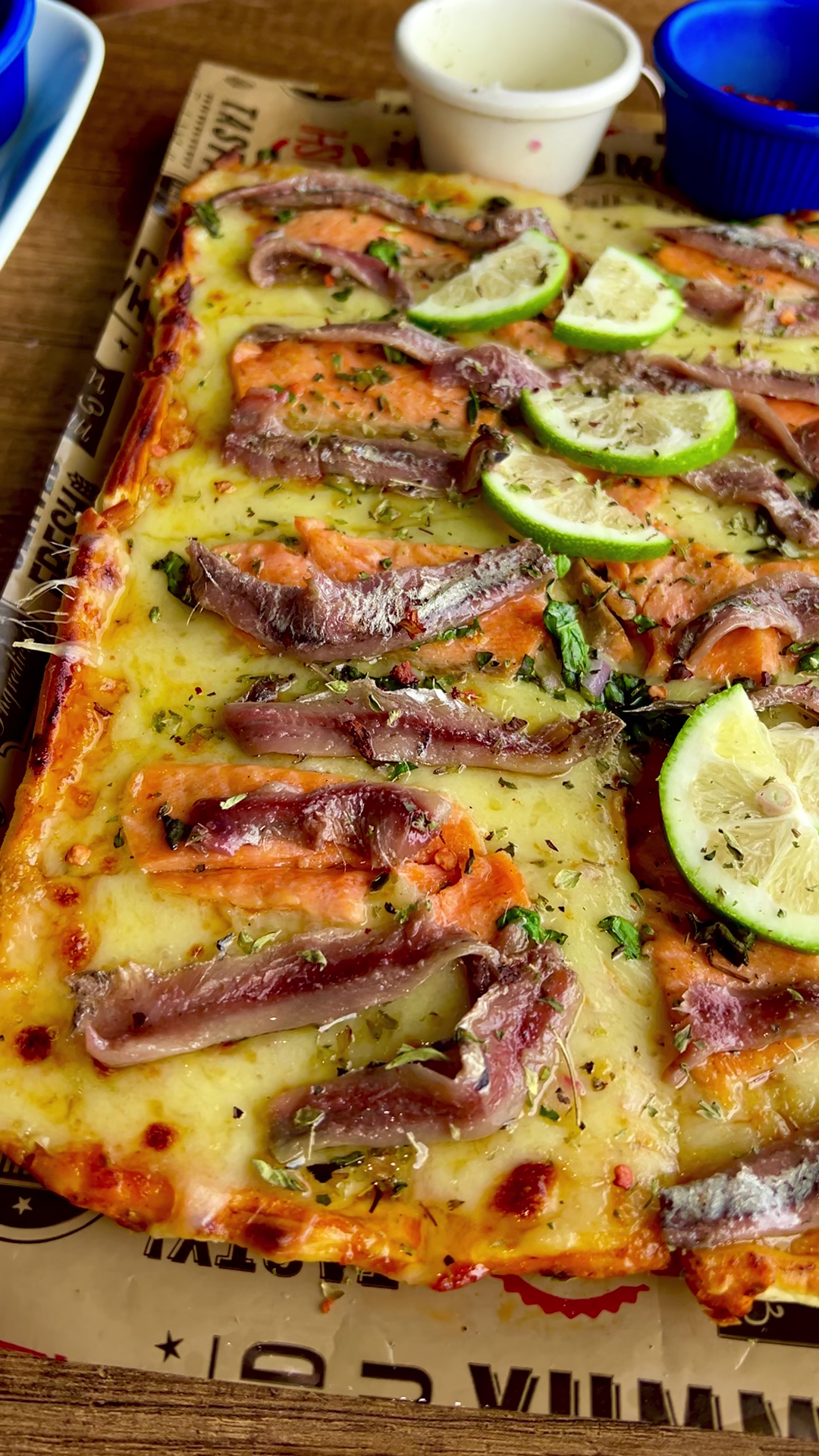 They have wonderful service, but inconsistent with the food. One day they have Limon on the top of the Salmon Pizza, the next day no Limon. When I asked them to top it with Limon like they did the 1st time, they took the pizza for several minutes and returned it with sloppy cut Limon’s and a soft warm pizza that wasn’t as good as or crispy as the night before when Renee was our server. The beer is NICE, the consistency of the food can be improved on. Nobody wants a cold soggy pizza with Salmon. The 1st video is the second day when the chef decided to be lazy. I added the anchovies afterwards, but the crust was already soft from taking 5minutes to cut the lemons and return the pizza. The second video shows beautifully cut Limon slices and a hot pizza. The food is very enjoyable when hot and fresh and prepared properly. The Limon flavor really gives it a boost in flavor but the second day the lemons barely had any juice to squeeze even a hint for extra flavor.They play nice music and the waiter Alexander was attentive...