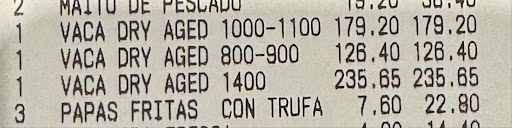 Read moreI have eaten in many places and it is the first time in my life that I feel cheated, it is the worst meat I have ever eaten in my life and they sell it at a bargain price. We arrived and the first surprise was when they handed us the cocktail menu without prices, then we were going to order the meat from the menu and the maitre d told us that we have to order the meat that has made them famous and that thanks to it they won awards!!! We ordered for everyone and the 15 people who were there couldn't eat it because either it was extremely hard or it had an extremely strong flavor (knowing perfectly well what matured meat is). It was a shame because we invited foreigners and we complained and the only thing they told us was that it may have been a cut that happened to us due to bad luck. The manager also tricked us by saying that they were going to call us the next day, 10 days have passed and no one has contacted us. THE VALUE OF THE MEAT IS A THEFT THEY CHARGED US $500 for meat that was wrapped in plastic!!!